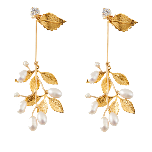Modern Museum Resin Pearl Long Stem Leaf Earrings